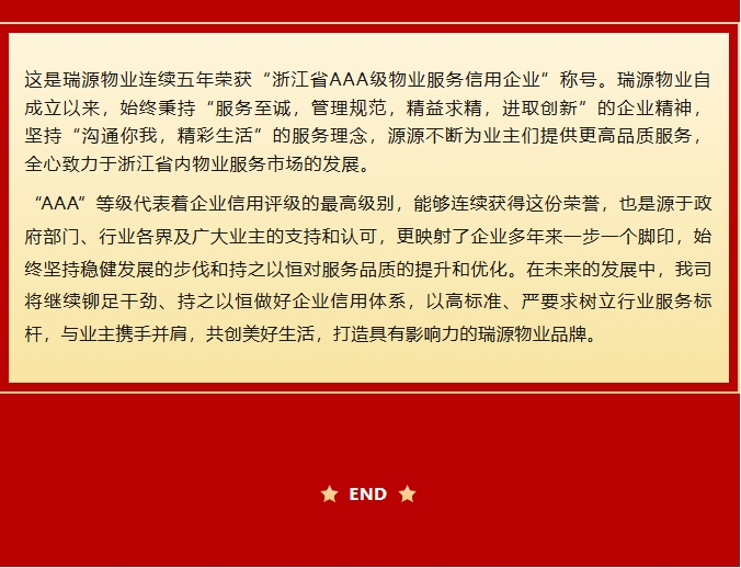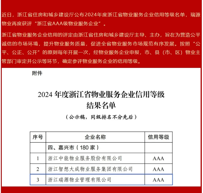 喜報丨瑞源物業(yè)成功續(xù)評浙江省AAA級物業(yè)服務企業(yè)